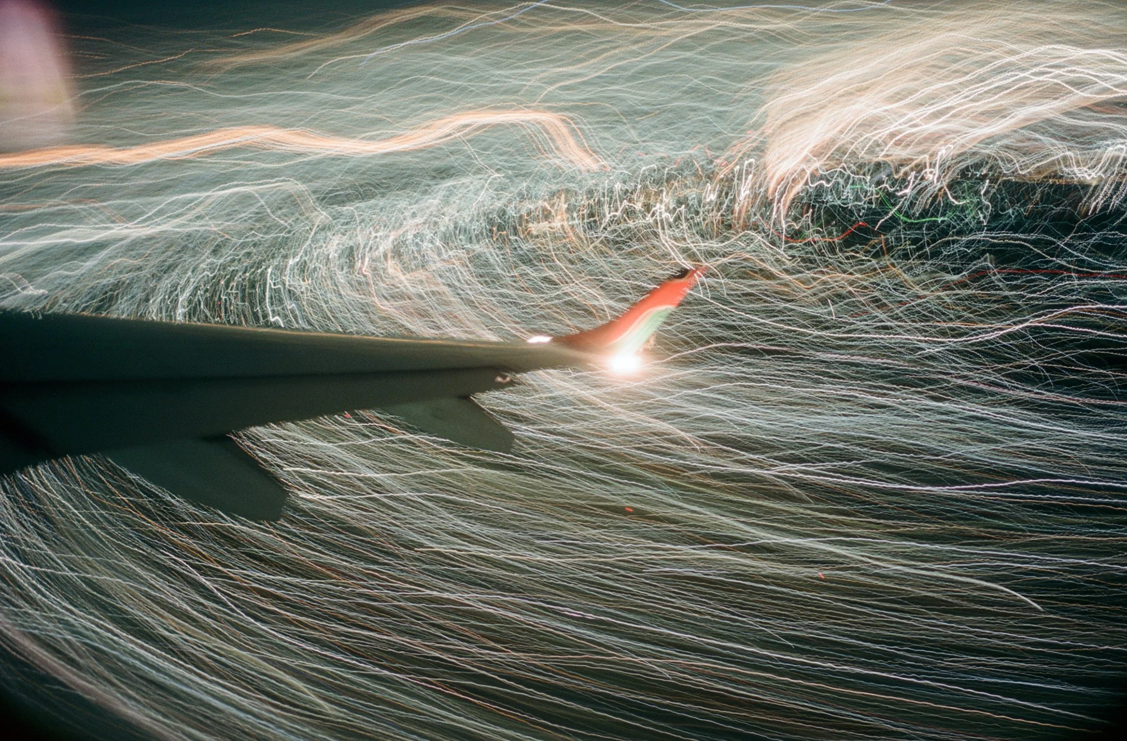 A series of long exposures taken from the window of aircraft while circling prior to landing which produce various circular patterns.